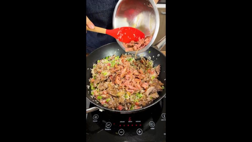 Assim que cozinhar, desfie as carnes, separe a mandioca e o caldo. Em uma panela, refogue a cebola, o alho, o pimentão, metade dos tomates picados no azeite, adicione o arroz e misture.