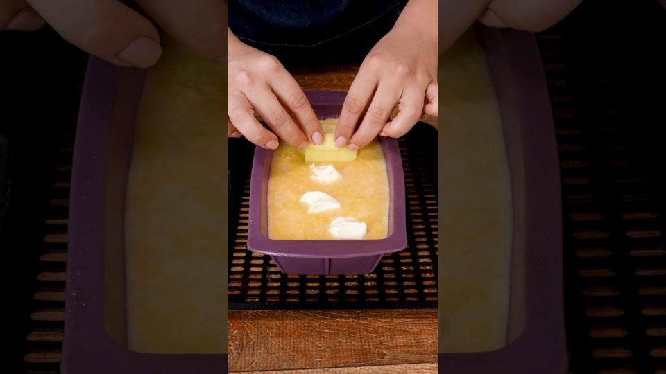 Acrescente o fermento químico e misture. Unte uma forma com azeite e despeje a massa. Por cima, coloque colheradas de requeijão e afunde levemente as fatias de muçarela. Se quiser, você também pode colocar alguns pedaços de goiabada.