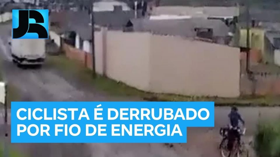 Em Santa Catarina, um ciclista foi derrubado por um fio de energia que ficou preso em um caminhão. A imagem mostra quando o caminhão passa pelo cruzamento e logo depois o fio enrosca na bicicleta e derruba o homem. Ele fica no chão enquanto a bicicleta é arrastada. O ciclista foi socorrido com pequenos ferimentos.