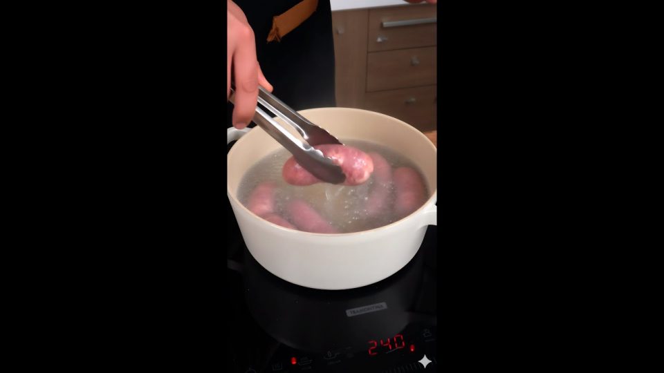 Em uma panela com água fervente, adicione os gomos de linguiça e cozinhe por 5 minutos. Corte os gomos de linguiça em rodelas, tempere com alho amassado, pimenta dedo de moça e orégano.