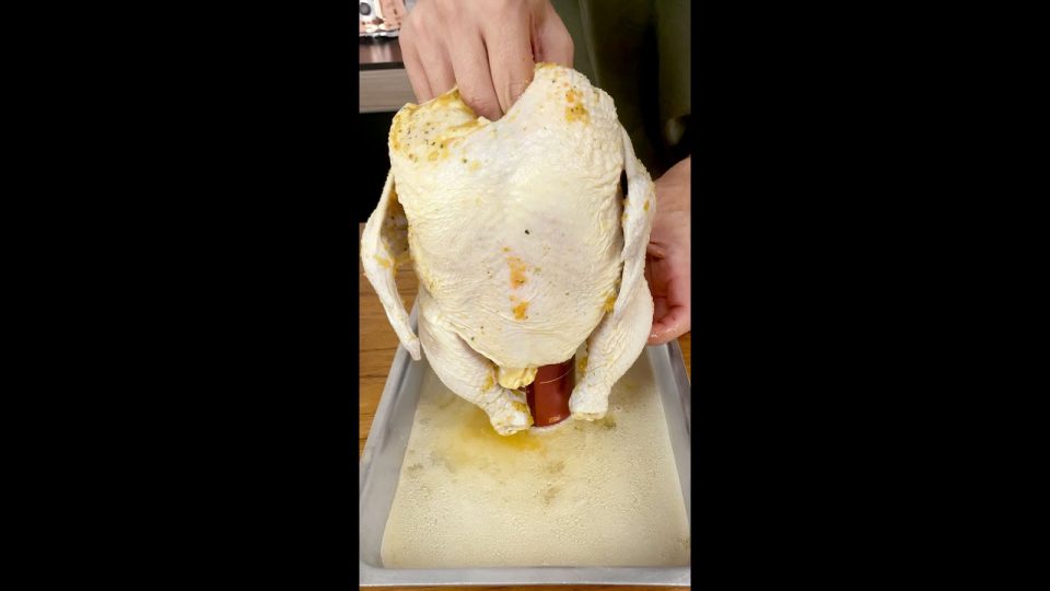 Em uma assadeira, coloque um pouco da cerveja e acomode o frango inteiro em cima da lata. Asse no forno a 230°C por 1h40 minutos.