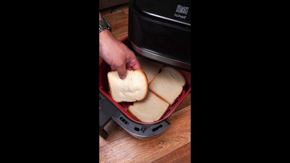 Aperte o centro do pão de forma, coloque-os na airfryer, espalhe o molho de tomate, adicione o presunto, o queijo muçarela, a azeitona, mais uma camada de pão e repita as camadas.