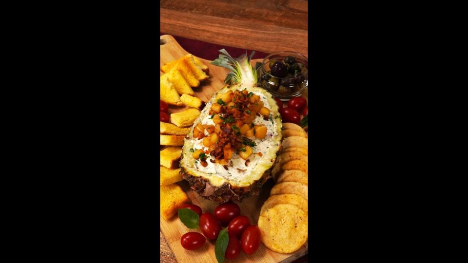 Utilize a casca do abacaxi higienizada como recipiente. Preencha a casca do abacaxi com o patê. Leve à geladeira antes de servir.