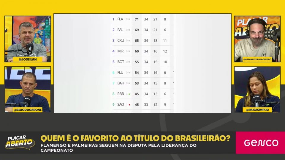 Flamengo e Palmeiras seguem cabeça a cabeça na disputa pelo Brasileirão! No Corte do Placar Aberto, analisamos quem realmente chega como favorito na reta final do campeonato. O Flamengo mantém a liderança? O Palmeiras tem a tabela mais favorável? Quais são os pontos fortes e fracos de cada equipe na briga pelo título? VEJA MAIS EM: https://placar.com.br/brasileirao/flamengo-tem-674-de-chances-de-titulo-mesmo-apos-tropeco-entenda/