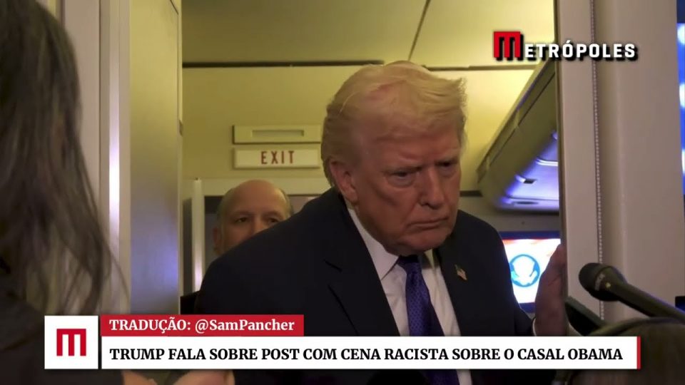BrasilDestaquesMundoÍntegra: veja o que disse Donald Trump sobre post com ataque racista ao casal Obama de admin06/02/2026021 Compartilhar0 Presidente dos EUA conversou com jornalistas a bordo do Air Force One #Trump #Obama #EUA source