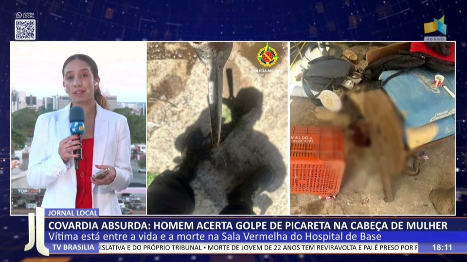 Brasília - DFCidadesDestaquesJL – Covardia absurda: homem acerta golpes de picareta na cabeça de mulher de admin26/10/2025012 Compartilhar0 24/10 – Vítima está entre a vida e a morte na Sala Vermelha do Hospital de Base. — De segunda a sexta, às 18h00 TV Brasília (canal 6.1, NET 18/518) Facebook.com/jornallocal (com transmissão ao vivo) Whatsapp (61) 9 9976 7011 source