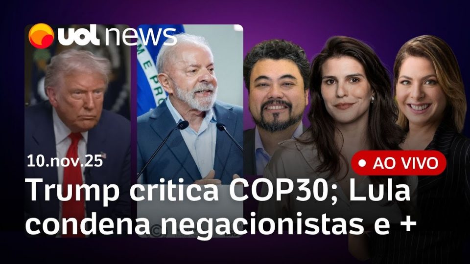 No UOL News 2ª Edição desta segunda-feira (10): Lula critica guerras, negacionismo e algoritmos e volta a pedir mapa para fim do petróleo na COP30; Ausente da COP, Trump critica evento e denuncia desmatamento; PL Antifacção: Derrite defende texto técnico sem polarizar com governo Lula; Moraes determina envio ao STF dados de câmeras de policiais envolvidos na megaoperação do Rio; Governo prepara novo pacote de ações para PR; Wellington Dias vai ao estado e mais notícias ao vivo com Natália Mota, Daniela Lima e Leonardo Sakamoto.