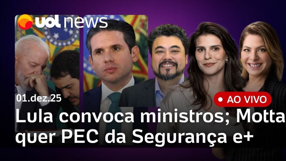 No UOL News 2ª Edição desta segunda-feira (1º): Lula almoça com relator da indicação de Messias para tentar atenuar crise; Lula convoca ministros para discutir crise com Senado; Motta quer aprovar PEC da Segurança Pública antes do recesso de fim do ano na Câmara; Defesa diz ao STF que Alzheimer de general Heleno foi diagnosticado em 2025; e mais notícias ao vivo com Natália Mota, Daniela Lima e Leonardo Sakamoto.