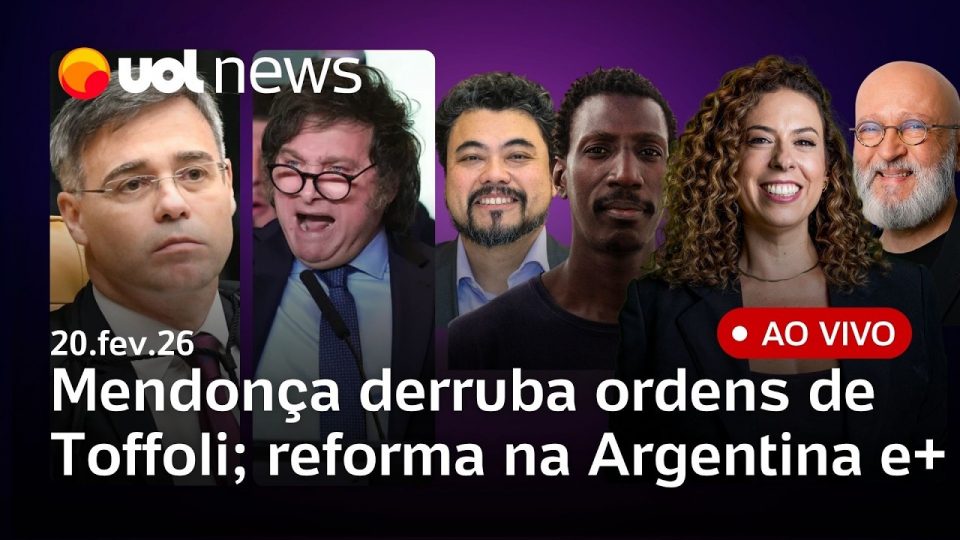 No UOL News 1ª edição desta sexta-feira (20): Mendonça desfaz ordem de Toffoli e amplia autonomia da PF no caso Master; ministro libera Vorcaro de depor na CPI do INSS; Usinas falidas viraram ‘fábricas de créditos’ de R$ 8,7 bi no Master; disputa ao Senado acirra tensão entre bolsonaristas em Santa Catarina; Michelle é cobrada nas redes, e Moraes autoriza novas visitas a Bolsonaro; STF formaliza ação contra Eduardo Bolsonaro; PL aciona o TSE para investigar desfile em homenagem a Lula e Janja vira alvo de polêmica no Sambódromo; Trump enfrenta julgamento sobre tarifaço e fala em atacar o Irã; Câmara aprova reforma trabalhista na Argentina; Lula cancela ida a debate sobre IA e mais notícias e análises ao vivo com Fabíola Cidral, Josias de Souza, Leonardo Sakamoto e Ronilso Pacheco.