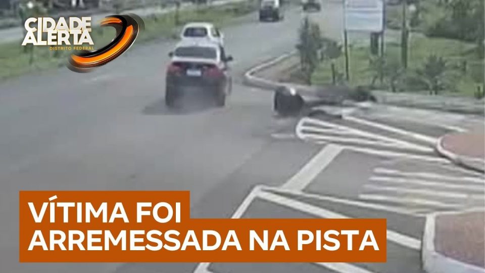 Um motociclista entregador de 32 anos foi atropelado em Sobradinho 2 (DF) por um carro preto. O acidente foi registrado por câmeras de segurança, e motorista fugiu sem prestar socorro. As imagens mostram o momento em que o veículo sai da faixa do meio, atinge a motocicleta e arremessa a vítima para a lateral da pista antes de acelerar e deixar o local.