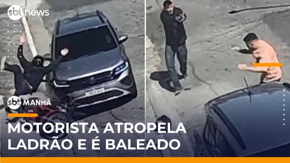 Um homem de 34 anos foi baleado após perseguir e atropelar um assaltante na região do Jabaquara, zona sul de São Paulo. Câmeras de segurança registraram o momento em que o motorista derruba o criminoso da moto. Ao se aproximar, é surpreendido por disparos. Um segundo suspeito aparece e ambos fogem. A vítima foi atingida por três tiros e socorrida sem risco de morte. A polícia busca os envolvidos. Saiba todos os detalhes no SBT Manhã.