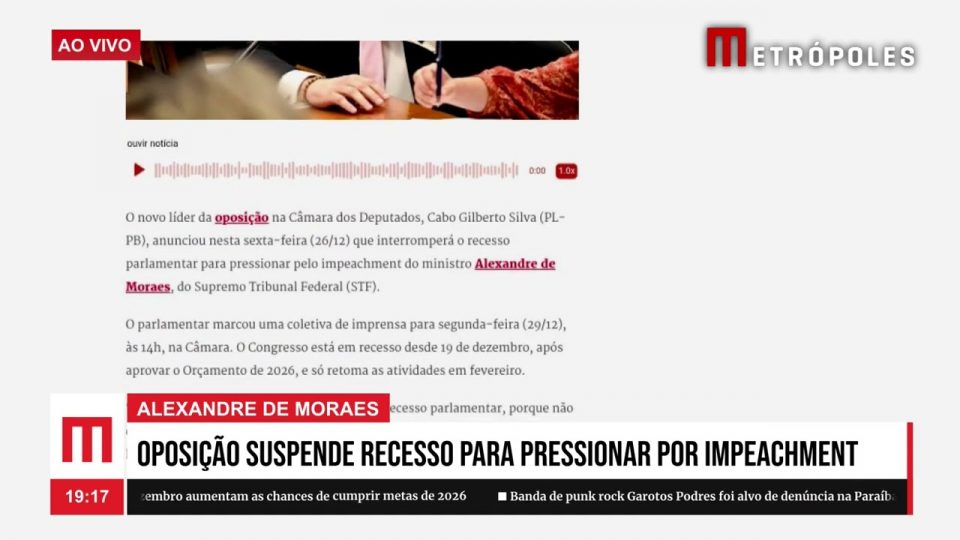O novo líder da oposição na Câmara dos Deputados, Cabo Gilberto Silva (PL-PB), anunciou, nesta sexta-feira (26/12), que interromperá o recesso parlamentar para pressionar pelo impeachment do ministro Alexandre de Moraes, do Supremo Tribunal Federal (STF).
