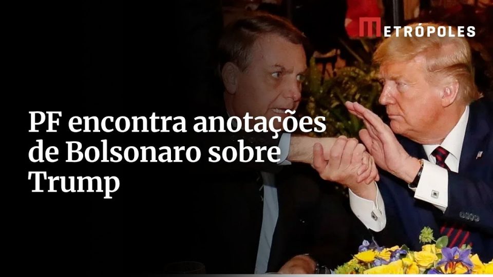 Anotações feitas à mão pelo ex-presidente Jair Bolsonaro, apreendidas pela Polícia Federal durante uma operação em julho, mostram referências diretas ao ex-presidente dos Estados Unidos, Donald Trump. Os papéis, encontrados na sede do PL em Brasília, trazem expressões como “JB alinhado DT” e “Trump e equipe validaram convite”. Para os investigadores, os registros revelam paralelos simbólicos entre os dois líderes, mas não têm valor probatório.