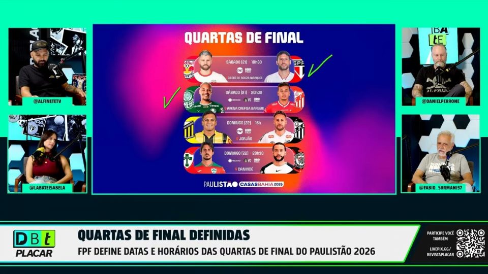 DestaquesEsportesQUARTAS DE FINAL DO PAULISTÃO, QUEM PASSA? | Corte Debate Placar de admin17/02/202606 Compartilhar0 FAÇA A SUA ASSINATURA! http://www.placar.com.br/MEMBROS ____ Deixa o like. 👍 Se inscreve no canal. 📩 Ative o sininho. 🔔 source