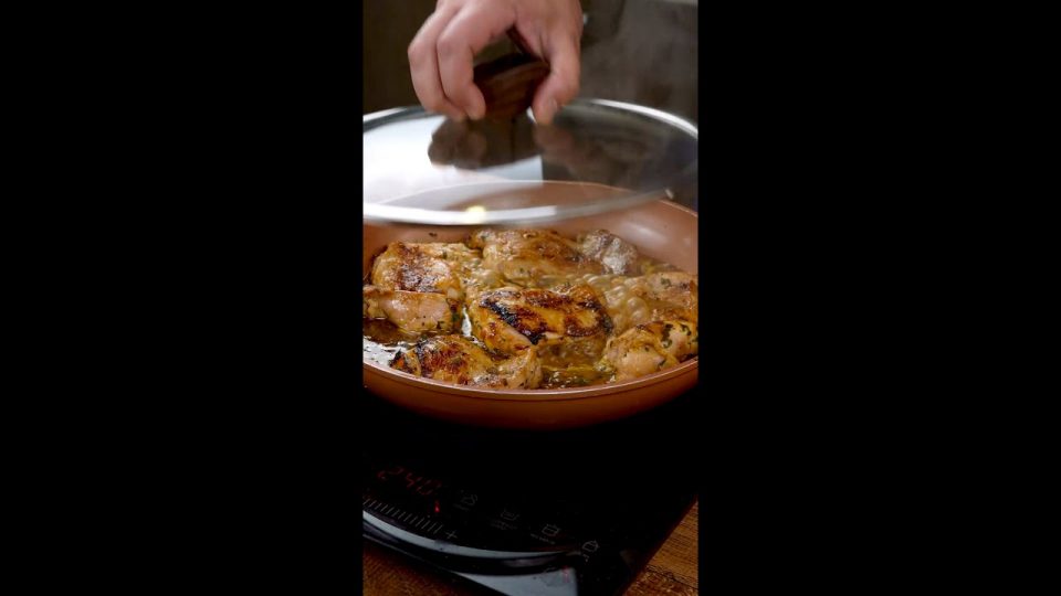 Acrescente o líquido da marinada e mexa, soltando o fundo da frigideira. Volte o frango para a frigideira, tampe e cozinhe por mais alguns minutos, até chegar ao ponto desejado.