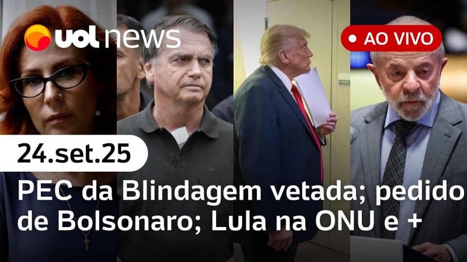 No UOL News 2ª Edição desta quarta-feira (24): CCJ do Senado rejeita PEC da Blindagem por unanimidade; Tarcísio diz esperar que Trump e Lula se resolvam e associa PEC da Blindagem a desconexão com povo; ONU divulga foto de Trump assistindo ao discurso de Lula na Assembleia Geral; Zanin marca julgamento de novo núcleo da trama golpista: veja quando; Bolsonaro pede ao STF fim de prisão domiciliar em ação que envolve Eduardo e mais notícias ao vivo com Diego Sarza, Daniela Lima e Leonardo Sakamoto.