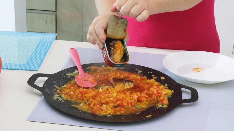 04:24 – O Ingrediente Principal: Adição da sardinha em lata e azeitonas ao refogado.