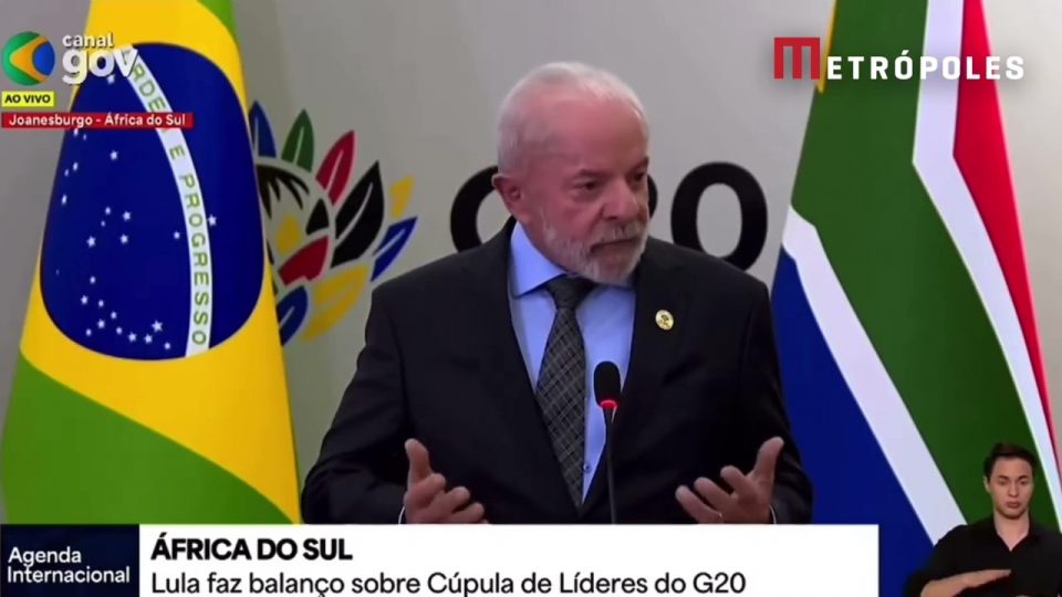 Lula fala sobre a prisão de Jair Bolsonaro durante coletiva de imprensa na cúpula do G20, em Joanesburgo, na África do Sul, neste domingo (23/11).