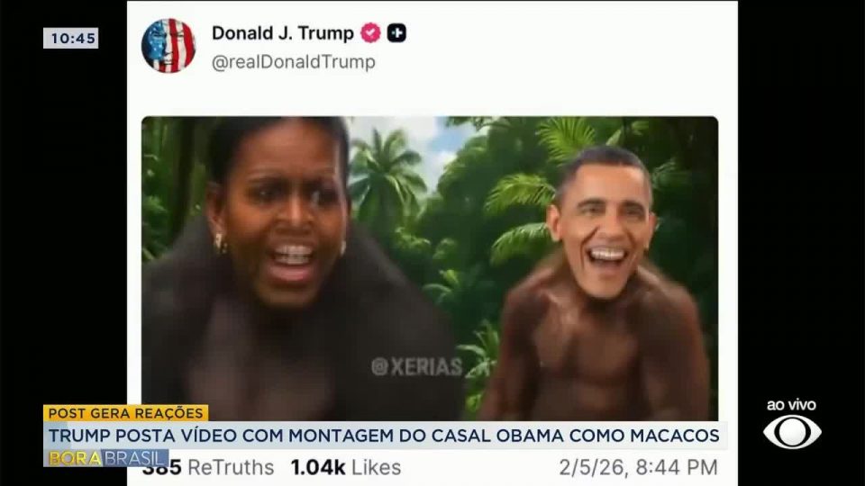 BrasilDestaquesMundoTrump posta vídeo de Obama e sua mulher como macacos de admin06/02/2026015 Compartilhar0 O presidente dos Estados Unidos Donald Trump publicou em sua rede social um vídeo que retrata o ex-presidente Barack Obama e sua esposa Michelle como macacos. source