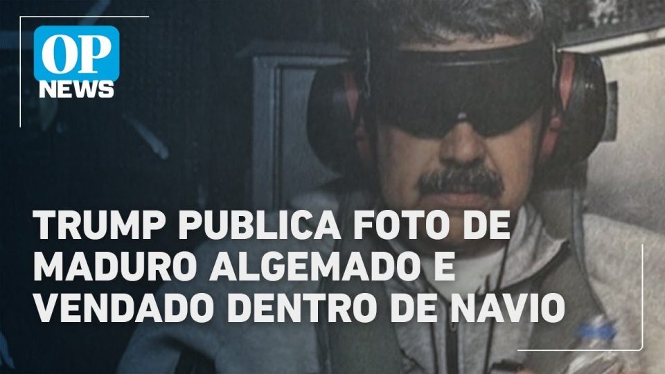 Maduro aparece com olhos vendados e algemado. O presidente da Venezuela foi capturado junto com a sua esposa após ataque das forças dos Estados Unidos a Caracas e aparece vendado, com algemas e vestindo moletom. “Nicolás Maduro a bordo do navio USS Iwo Jima”, escreveu o norte-americano na legenda.