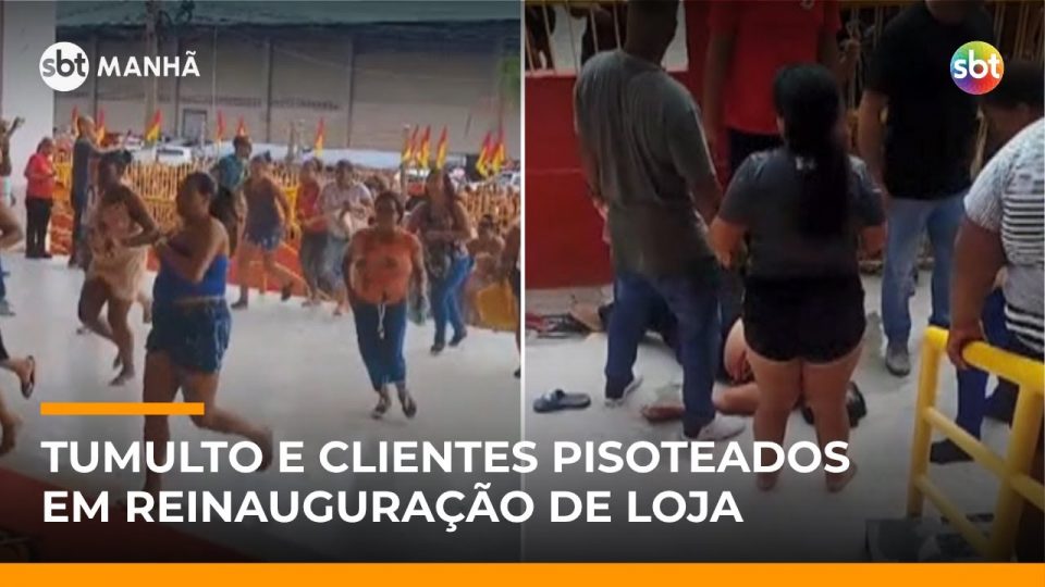 Um tumulto marcou a reinauguração de uma loja de utilidades para o lar em Duque de Caxias (RJ), na Baixada Fluminense. Imagens mostram correria e pessoas sendo pisoteadas após a abertura das portas. Um portão caiu sobre três vítimas, segundo a polícia. Duas mulheres ficaram feridas, sem gravidade, e foram levadas ao hospital. A Polícia Militar e o Corpo de Bombeiros foram acionados para controlar a situação. Saiba todos os detalhes no SBT Manhã.